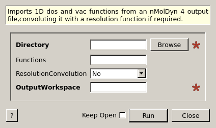 The ‘Directory’ property must be given the directory that is produced when you extract the ‘.tar’ archive from nMOLDYN without modifications which must only contain the data files produced from a single nMOLDYN export operation. Crucially, there must be a ‘\frequency.dat’ file in order to load dos data and a ‘\time.dat’ file in order to load vacf data.