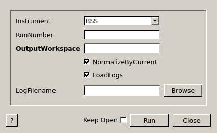 | Instrument | Input | string | Mandatory | Empty uses default instrument. Allowed values: [‘BSS’, ‘SNAP’, ‘REF_M’, ‘CNCS’, ‘EQSANS’, ‘VULCAN’, ‘VENUS’, ‘MANDI’, ‘TOPAZ’, ‘ARCS’] |
