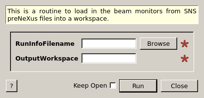 This algorithm reads in the filenames of the monitors from the runinfo file. It will only work with histogram monitors and assumes that all monitors are on the same time axis. It also assumes that the beam monitor files are in the same directory as the runinfo file.