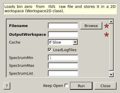 Loads just bin0 for all spectra from the given ISIS RAW file and stores it in a 2D workspace. You may optionally specify certain spectra to read in.