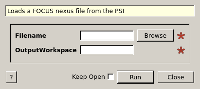 | Filename | Input | string | Mandatory | The name of the Nexus file to load. Allowed extensions: [‘.nxs’, ‘.hdf’] |