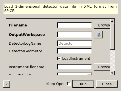| SpiceTableWorkspace | Input | TableWorkspace | Name of TableWorkspace loaded from SPICE scan file by LoadSpiceAscii. | |