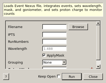 Loads Event Nexus file, integrates events, sets wavelength, mask, and goniometer, and sets proton charge to monitor counts