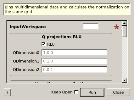| Dimension0Binning | Input | dbl list | Binning for the 0th dimension. - Leave blank for complete integration - One value is interpreted as step - Two values are interpreted integration interval - Three values are interpreted as min, step, max | |