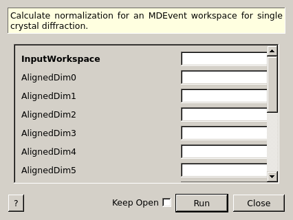 | TemporaryNormalizationWorkspace | Input | IMDHistoWorkspace | An input MDHistoWorkspace used to accumulate normalization from multiple MDEventWorkspaces. If unspecified a blank MDHistoWorkspace will be created. | |