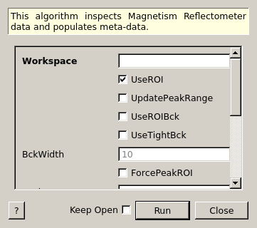 | PeakROI | Input | long list | 0,0 | Pixel range defining the reflectivity peak |