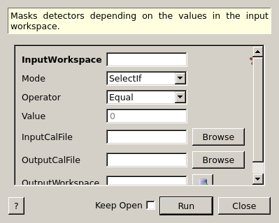 the InputCalFile are copied over to the OutputCalFile.OutputWorkspace property has to be set. The algorithm masks the selected detectors (Mode='SelectIf') or unmasks deselected ones (Mode='DeselectIf') for the output workspace. Masking does not clear the data in the spectra under question. Use ClearMaskedSpectra to clear the masked data manually.Example - mask spectra whose integral is below some limit