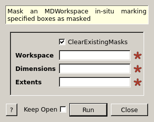 This algorithm will first clear-out any existing masking and then apply the new masking, unless ClearExistingMasks is set to false. Note that masking removes data; clearing existing masks only removes the mask flag from boxes/bins. For MDEventWorkspaces masking deletes events from masked boxes. Similarly, for MDHistoWorkspaces the signal of masked bins is set to NaN.