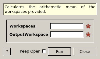 | OutputWorkspace | Output | MatrixWorkspace | Mandatory | Output mean workspace |