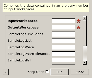 | SampleLogsWarn | Input | string | A comma separated list of the sample logs to generate a warning if different when merging. | |