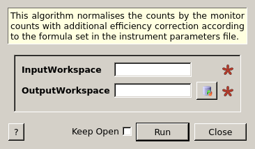 This algorithm normalises the counts by the monitor counts with additional efficiency correction according to the formula set in the instrument parameters file.