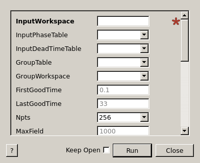 | InputWorkspace | Input | Workspace | Mandatory | Raw muon workspace to process |