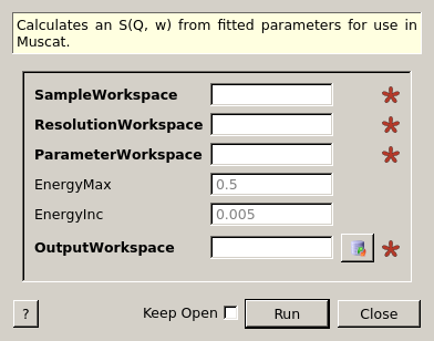 | OutputWorkspace | Output | MatrixWorkspace | Mandatory | Output workspace in S(Q, w) |