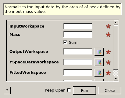 | OutputWorkspace | Output | MatrixWorkspace | Mandatory | Input workspace normalised by the fitted peak area |