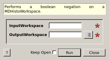 Perform the Not (negation) boolean operation on a MDHistoWorkspace. The not operation is performed element-by-element. Any 0.0 signal is changed to 1.0 (meaning true). Any non-zero signal is changed to 0.0 (meaning false).