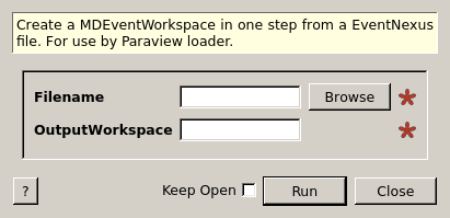 | OutputWorkspace | Output | Workspace | Mandatory | Name of the output MDEventWorkspace. |