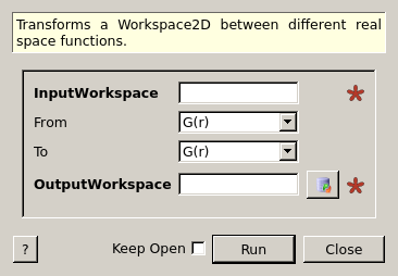 | From | Input | string | G(r) | Function type in the input workspace. Allowed values: [‘G(r)’, ‘GK(r)’, ‘g(r)’] |