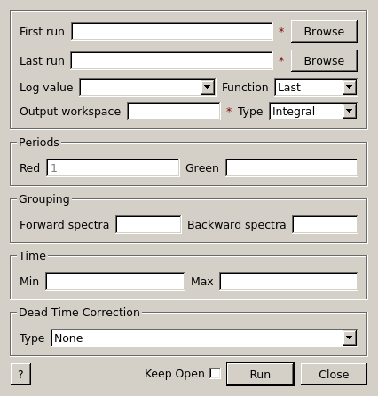 | DeadTimeCorrType | Input | string | None | Type of Dead Time Correction to apply. Allowed values: [‘None’, ‘FromRunData’, ‘FromSpecifiedFile’] |