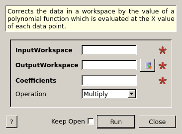 Corrects the data in a workspace by the value of a polynomial function which is evaluated at the X value of each data point.