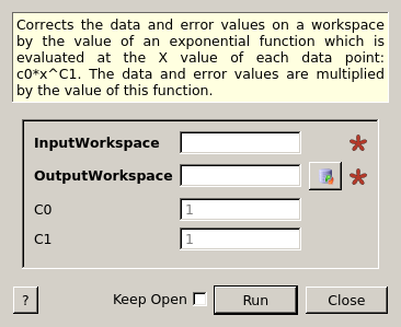 Corrects the data and error values on a workspace by the value of an exponential function which is evaluated at the X value of each data point: c0*x^C1. The data and error values are multiplied by the value of this function.