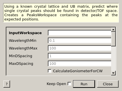 | HKLPeaksWorkspace | Input | PeaksWorkspace | Optional: An input PeaksWorkspace with the HKL of the peaks that we should predict. The WavelengthMin/Max and Min/MaxDSpacing parameters are unused if this is specified. | |