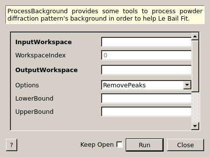 | OutputWorkspace | Output | Workspace2D | Output workspace containing processed background | |