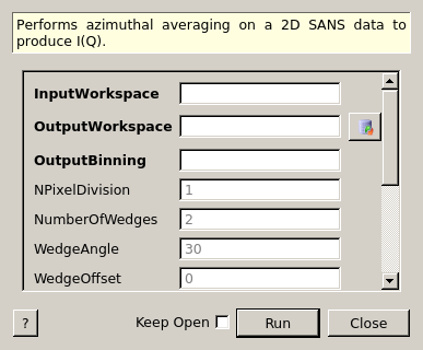 | WedgeWorkspace | Output | WorkspaceGroup | Name for the WorkspaceGroup containing the wedge I(q) distributions. | |