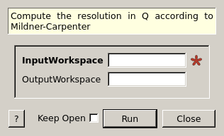 | OutputWorkspace | Input | string | Obsolete: not used - The resolution is added to input workspace |