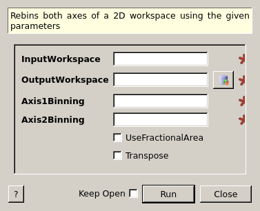 | Axis2Binning | Input | dbl list | Mandatory | A comma separated list of first bin boundary, width, last bin boundary. Optionally this can be followed by a comma and more widths and last boundary pairs. Negative width values indicate logarithmic binning. |