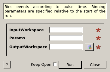 Rebins an EventWorkspace according to the pulse times of each event rather than the time of flight Rebin v1. The Params inputs may be expressed in an identical manner to the Rebin v1 algorithm. Param arguments are in seconds since run start. Users may either provide a single value, which is interpreted as the step (in seconds), or three comma separated values start, step, end, where all units are in seconds, and start and end are relative to the start of the run.