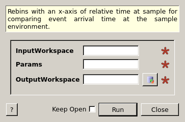 | Params | Input | dbl list | Mandatory | A comma separated list of first bin boundary, width, last bin boundary. Optionally this can be followed by a comma and more widths and last boundary pairs. Values are in seconds since run start. |