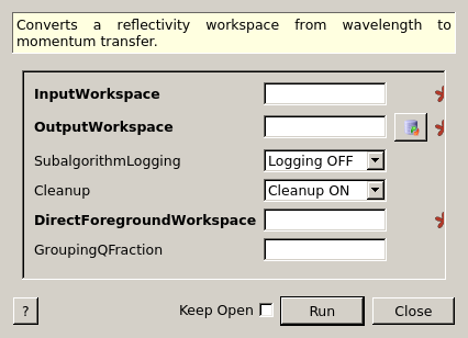 | InputWorkspace | Input | MatrixWorkspace | Mandatory | A reflectivity workspace in wavelength to be converted to Q. |