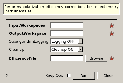 The algorithm loads the polarization efficiencies from EfficiencyFile. This file should be in the ILL format as LoadILLPolarizationFactors is used for loading.