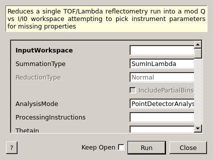 | ReductionType | Input | string | Normal | The type of reduction to perform when summing in Q. Allowed values: [‘Normal’, ‘DivergentBeam’, ‘NonFlatSample’] |