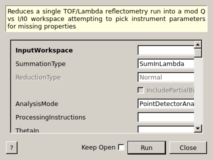 | ReductionType | Input | string | Normal | The type of reduction to perform when summing in Q. Allowed values: [‘Normal’, ‘DivergentBeam’, ‘NonFlatSample’] |