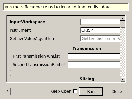 - PostProcessingAlgorithm=’ReflectometryReductionOneLiveData’, PostProcessingProperties=’Instrument=INTER’, AccumulationMethod=’Replace’,AccumulationWorkspace=’TOF_live’,OutputWorkspace=’IvsQ_binned_live’,)