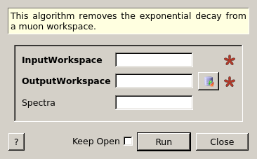 This algorithm removes the exponential time decay from the specified muon spectra, leaving the rest unchanged. By default, all the spectra in a workspace will be corrected. If the detector records a total of zero counts (i.e. the detector is dead) then the output will be all zeros for that detector.