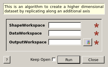 The ShapeWorkspace input defines the shape of the OutputWorkspace, but not the contents. The DataWorkspace provides the data contents in the lower dimensionality cut, which will be replicated over. This algorithm operates on MDHistoWorkspace inputs and provides a MDHistoWorkspace as an output.