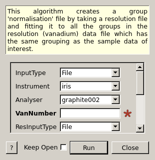 This algorithm creates a group ‘normalisation’ file by taking a resolution file and fitting it to all the groups in the resolution (vanadium) data file which has the same grouping as the sample data of interest.
