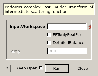 The group workspace should contain workspaces _fqt.Re and _fqt.Im containing the real and imaginary parts of the intermediate structure factor, respectively. This algorithm will take both and perform FFT v1, storing the real part of the transform in workspace _fqw and placing this workspace under the input group workspace. Assuming the time unit to be one picosecond, the resulting energies will be in units of one micro-eV.