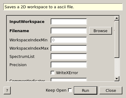 | InputWorkspace | Input | MatrixWorkspace | Mandatory | The name of the workspace containing the data you want to save to a Ascii file. |