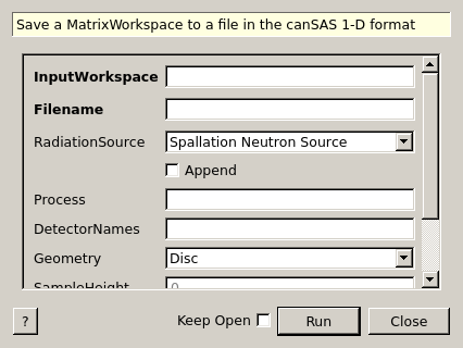 | Append | Input | boolean | False | Selecting append allows the workspace to be added to an existing canSAS 1-D file as a new SASentry |