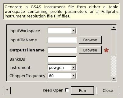 Generate a GSAS instrument file from either a table workspace containing profile parameters or a Fullprof’s instrument resolution file (.irf file).