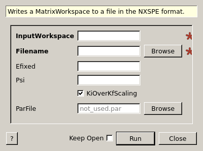 | Filename | Input | string | Mandatory | The name of the NXSPE file to write, as a full or relative path. Allowed extensions: [‘.nxspe’] |