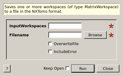 | Filename | Input | string | Mandatory | The name of the NXTomo file to write, as a full or relative path. Allowed extensions: [‘.nxs’] |