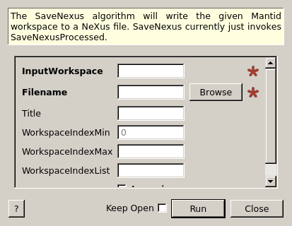 | Filename | Input | string | Mandatory | The name of the Nexus file to write, as a full or relative path. Allowed extensions: [‘.nxs’, ‘.nx5’, ‘.xml’] |