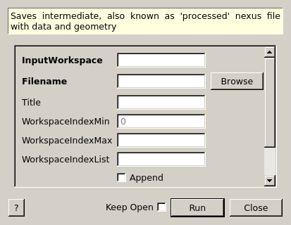 | Append | Input | boolean | False | Determines whether .nxs file needs to be over written or appended |