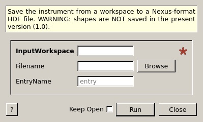 Save the instrument from a workspace to a Nexus-format HDF file. WARNING: shapes are NOT saved in the present version (1.0).