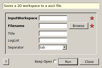 | InputWorkspace | Input | MatrixWorkspace | Mandatory | The name of the workspace containing the data you want to save. |