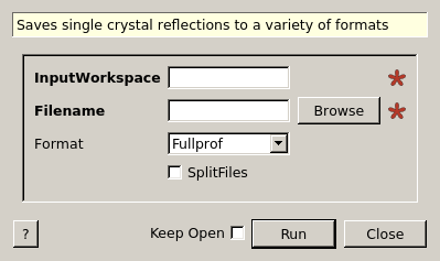 | Format | Input | string | Fullprof | The output format to export reflections to. Allowed values: [‘Fullprof’, ‘GSAS’, ‘Jana’, ‘SHELX’] |
